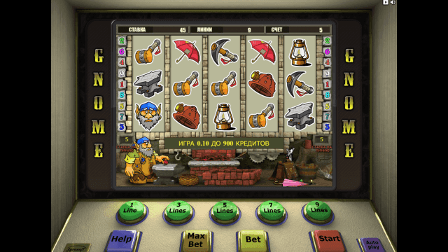 В видеослоте Gnome имеется 5 барабанов и 9 линий. Действует многоуровневая система ставок. Количество активных линий можно изменять. Стоимость одного кредита равняется одному рублю. Минимальная ставка на каждую линию — 1 руб., максимальная — 90 единиц игровой валюты.